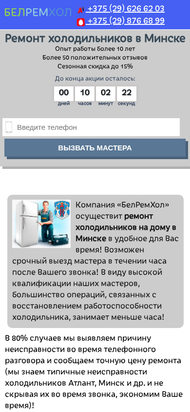 SEO-описание | Ремонт холодильников в Минске ❄ Ремонтируем Атлант, Minsk, Samsung, Indesit, Bosch ☎ 375(29) 626-62-03 ❄ Большой опыт ❄ Гарантия ❄ В день заказа ❄ |
