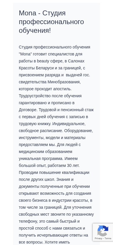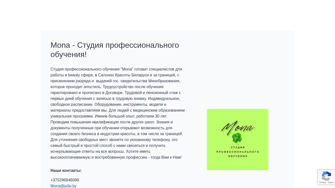 | AI-анализ | This online resource, titled "Mona - Студия профессионального обuчения!" (Mona - Professional Education Studio), is a Belarusian website dedicated to offering professional education in the beauty industry. The website guarantees employment upon completion of the training and provides all necessary equipment, instruments, models, and materials. It also offers a unique program for individuals with medical education. The studio has been operating for 30 years and offers flexible schedules. The obtained knowledge and documents from the training enable individuals to start their own business in the beauty industry, both domestically and internationally. Interested parties can contact the studio via the provided phone number or email address for more information. The website also includes a form for visitors to create a free website-business card with hoster.by. |
