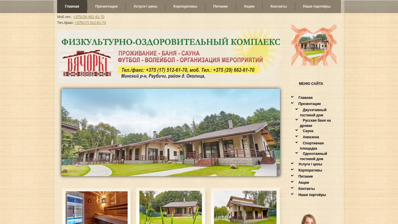 SEO-описание | Физкультурно-оздоровительный комплекс «Вячоркi», расположенный недалеко от спорткомплекса «Раубичи» и Дубровского водохранилища, представляет собой интересное сочетание современного лаконичного стиля с исконно белорусскими традициями |