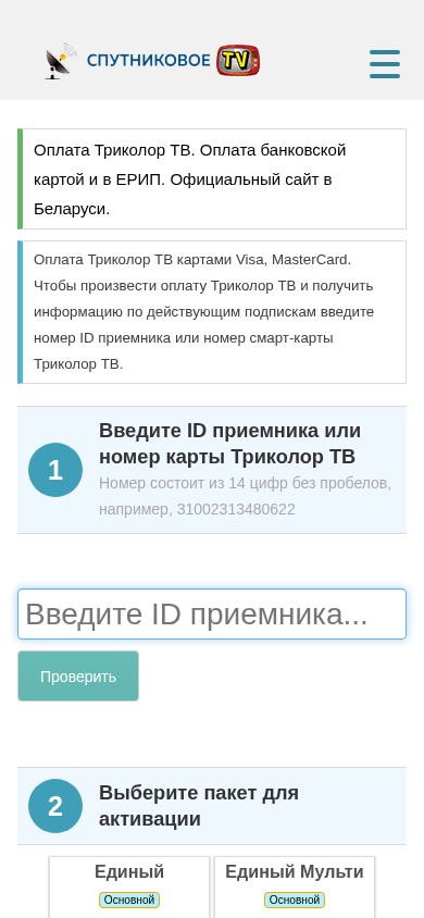 SEO-описание | Триколор оплата официально. Оплата банковскими картами и в ЕРИП. Введите ID приемника или номер карты Триколор ТВ. Быстрая активация! |
