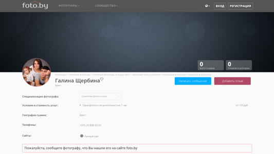 | AI-анализ | --- This online resource represents the photography portfolio of Galina Щербина, a photographer based in Brest, Belarus. The website primarily focuses on family photography, and the main categories include child photography, family photography, and photography for pregnant women. The photographer's work is available in Brest. |