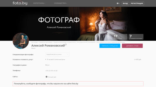 | AI-анализ | --- The web project "Photographer Alexey Romanyovsky, Minsk. Photographs in the "Wedding Photography" category" is a photography portfolio site for Alexey Romanyovsky, a wedding photographer based in Minsk, Belarus. He specializes in wedding photography and offers his services in various cities including Minsk, Brest, Gomel, Vitsebsk, Grodno, Mogilev, Baranovichy, Pinsk, and Bobruisk. The site includes a catalog of photographers, a community for photographers, and a blog. The main page displays a catalog of photographers by default. The site also features a section for user reviews, with 17 reviews in total for this photographer. The site is available in both Russian and Belarusian languages. The photographer's contact information, including a phone number and |