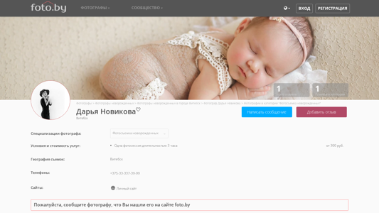 | AI-анализ | The web project is a photography site by Daria Novikova, based in Vitsebsk, Belarus. It features a category dedicated to newborn photography. The site is part of the larger community of photographers on Foto.by, and can be accessed under the 'Photographers' tab in the main catalog or by visiting Daria Novikova's personal page directly. The photographer offers her services as a newborn photographer in Vitsebsk, with pricing starting at 300 rubles for a three-hour session. The site includes a portfolio of her work, as well as contact information, including a phone number and personal website. Visitors can also leave reviews and read others' opinions of Daria's photography. The site is accessible at darya-novikova.foto.by. |