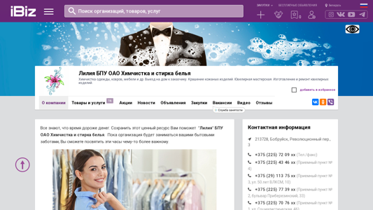 Название / Заголовок | Лилия БПУ ОАО Химчистка и стирка белья - Химчистка одежды, ковров, мебели и др. Выезд на дом к заказчику. Крашение кожаных изделий. Ювелирная мастерская. Изготовление и ремонт ювелирных изделий.. 213728, Бобруйск, , Революционный пер., 3 |