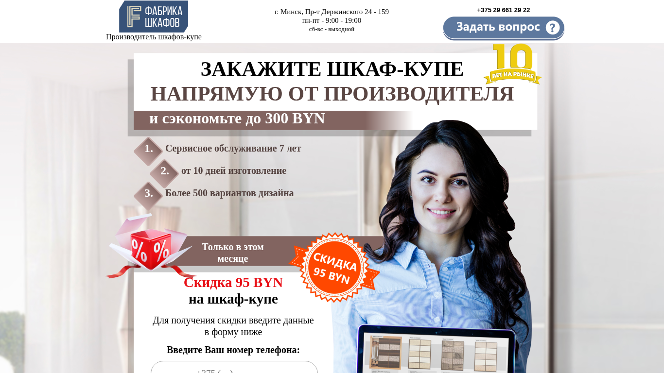 SEO-описание | Изготавливаем красивые и качественные шкафы-купе: корпусные, встраиваемые и угловые. Покупая напрямую у производителя, Вы экономите 100-300 BYN. Посмотрите полный каталог шкафов-купе с ценами, переходите на сайт! |