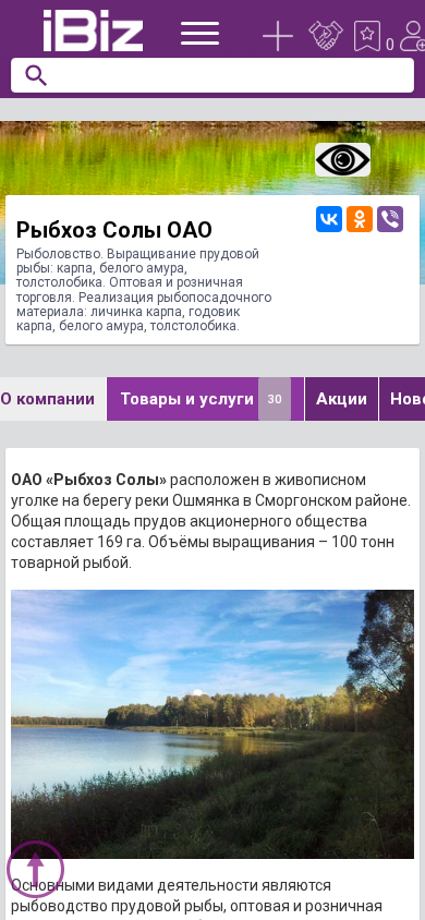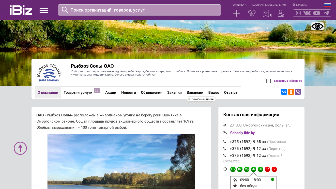 Название / Заголовок | Рыбхоз Солы ОАО - Рыболовство. Выращивание прудовой рыбы: карпа, белого амура, толстолобика. Оптовая и розничная торговля. Реализация рыбопосадочного материала: личинка карпа, годовик карпа, белого амура, толстолобика.. 231003, , Солы аг. |