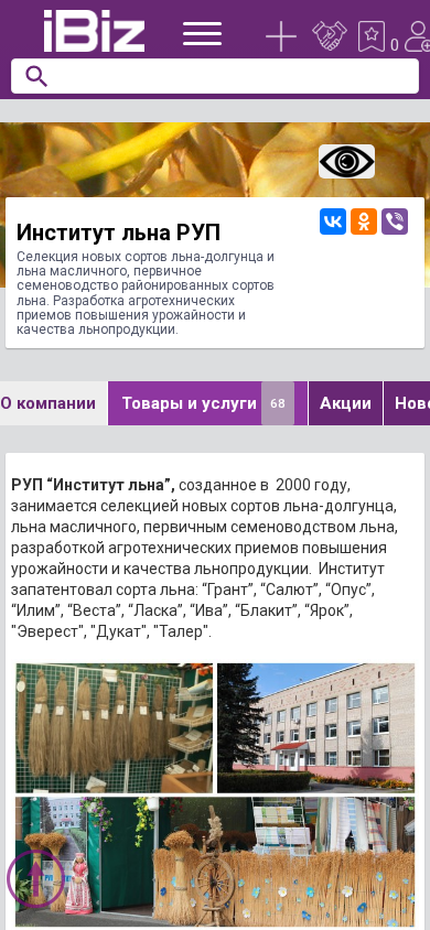 Название / Заголовок | Институт льна РУП - Селекция новых сортов льна-долгунца и льна масличного, первичное семеноводство районированных сортов льна. Разработка агротехнических приемов повышения урожайности и качества льнопродукции.. 211003, , Устье аг., Центральная, 27 |