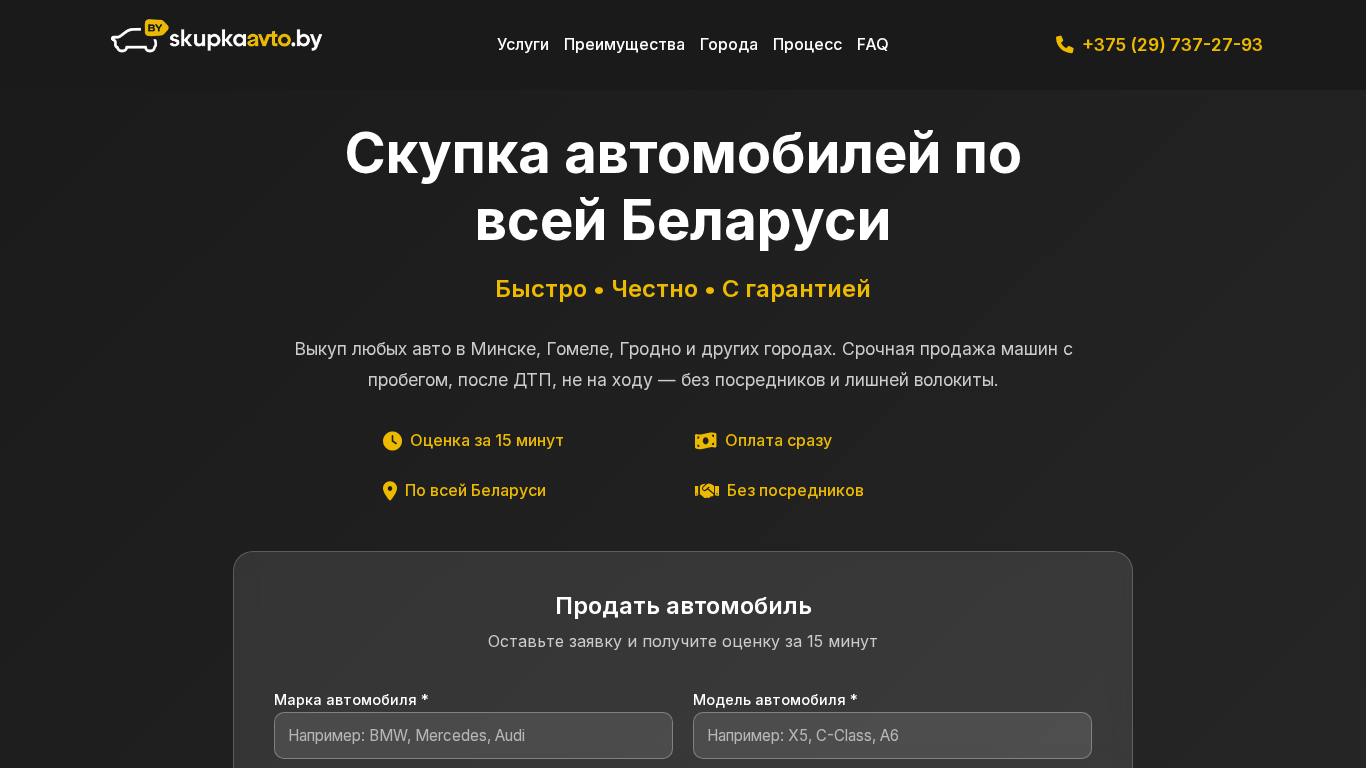 | SEO-описание | Скупка авто в Минске и Беларуси 🚗 Выкуп любых машин — быстро, выгодно, надёжно. Мгновенная оценка, оформление и оплата. 📞 +375 29 737 2793 |