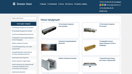 | AI-анализ | This online resource, titled "Водоотводные лотки. Западная башня" (Drainage Tanks. Western Tower), offers a range of drainage solutions. The product selection includes plastic and concrete drainage channels, grated surfaces, rainwater collectors, and cast iron grates. Keywords related to the offered items are frequently used, such as "водоотводные" (drainage), "решетки" (grates), and various dimensions and series of the products. The company, named "ЗАПАДНАЯ БАШНЯ" (Zapadnaya Bashnya), can be contacted via multiple phone and email options provided on the website. The categories of goods include drainage channels, various types of grates, and drainage systems. |