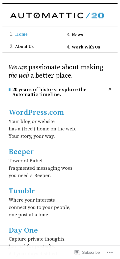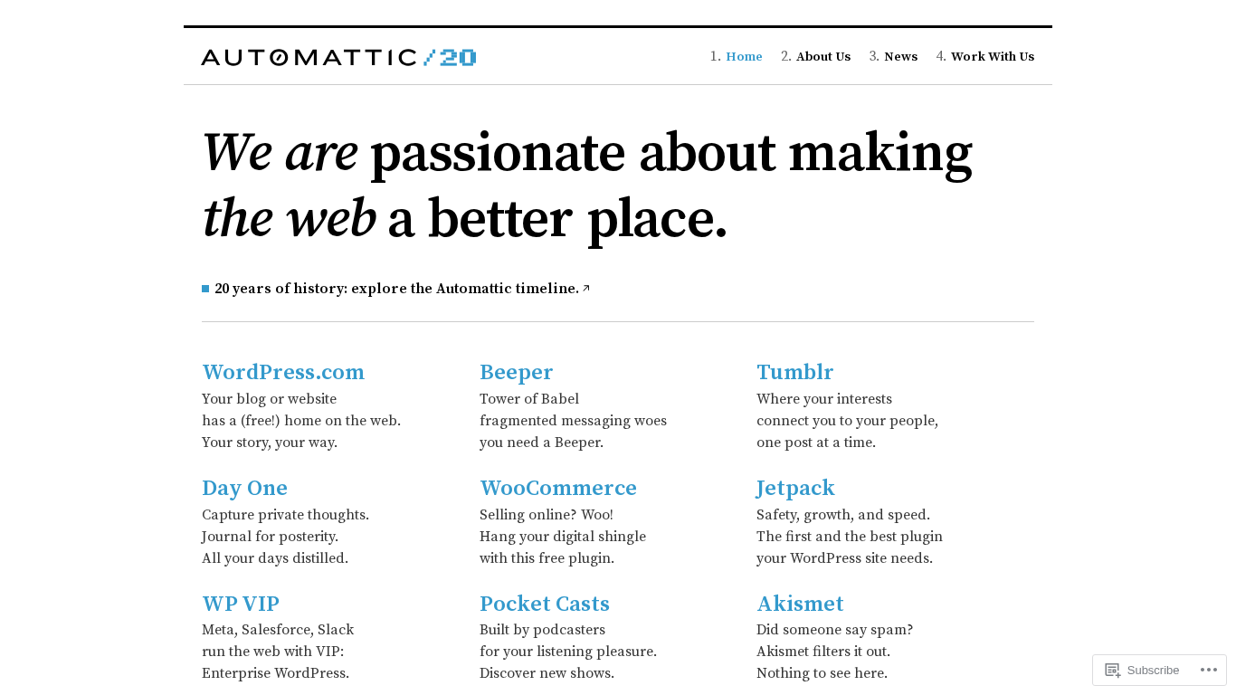 SEO-описание | We are passionate about making the web a better place. 20 years of history: explore the Automattic timeline. WordPress.com Your blog or website has a (free!) home on the web. Your story, your way. Beeper Tower of Babel fragmented messaging woes you need a Beeper. Tumblr Where your interests connect you to your people, one post at… |