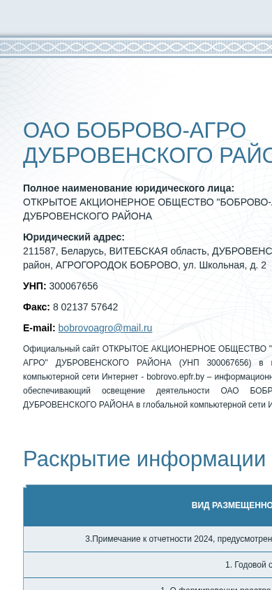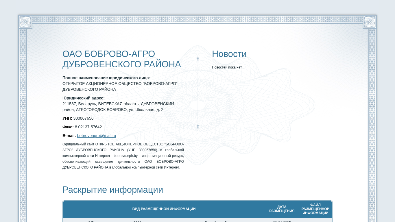 Название / Заголовок | БОБРОВО-АГРО ДУБРОВЕНСКОГО РАЙОНА ОАО |