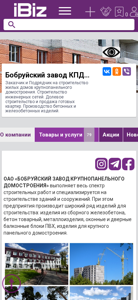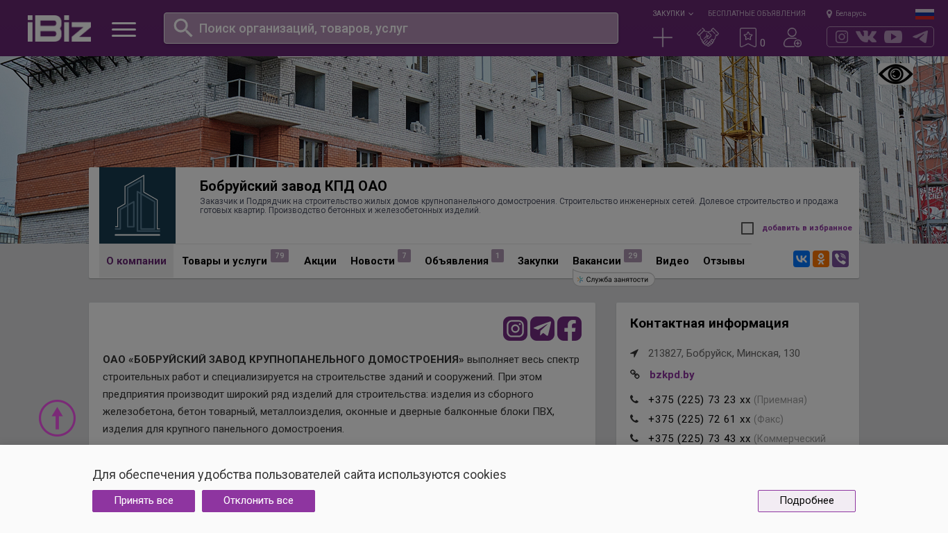 Название / Заголовок | Бобруйский завод КПД ОАО - Заказчик и Подрядчик на строительство жилых домов крупнопанельного домостроения. Строительство инженерных сетей. Долевое строительство и продажа готовых квартир. Производство бетонных и железобетонных изделий.. 213827, Бобруйск, , Минская, 130 |