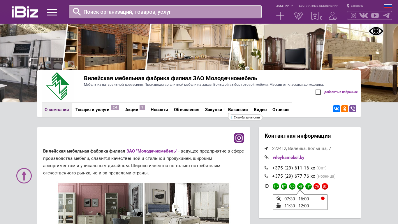 Название / Заголовок | Вилейская мебельная фабрика филиал ЗАО Молодечномебель - Мебель из натуральной древесины. Производство элитной мебели на заказ. Большой выбор готовой мебели. Массив от классики до модерна.. 222412, Вилейка, , Волынца, 7 |