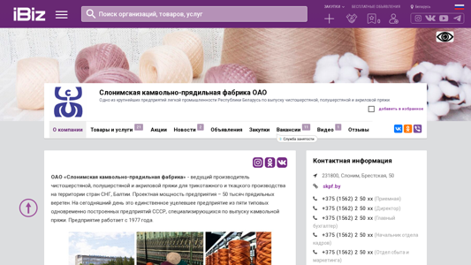 Название / Заголовок | Слонимская камвольно-прядильная фабрика ОАО - Одно из крупнейших предприятий легкой промышленности Республики Беларусь по выпуску чистошерстяной, полушерстяной и акриловой пряжи. . 231800, Слоним, , Брестская, 50 |