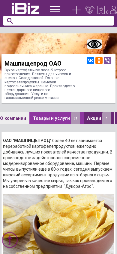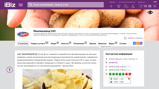 Название / Заголовок | Машпищепрод ОАО - Сухое картофельное пюре быстрого приготовления. Пеллеты для чипсов и снеков. Солод ржаной. Готовые картофелепродукты. Семечки подсолнечника жареные. Производство нестандартного пищевого оборудования. Услуги по газоплазменной резке металла.. 222830, Марьина Горка, , Чапаева, 15 |