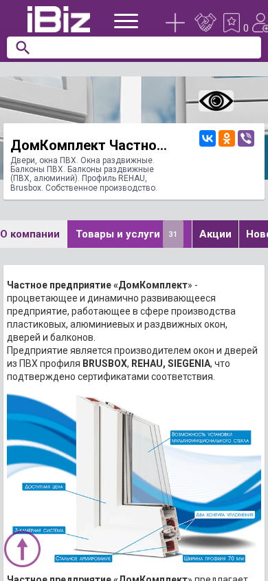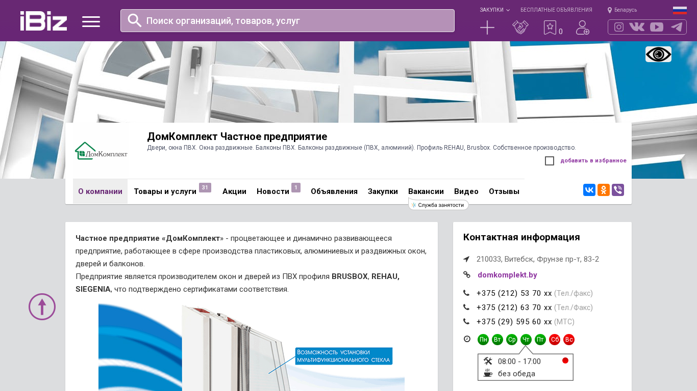 Название / ЗаголовокДомКомплект Частное предприятие - Двери, окна ПВХ. Окна раздвижные. Балконы ПВХ. Балконы раздвижные (ПВХ, алюминий). Профиль REHAU, Brusbox. Собственное производство.. 210033, Витебск, Фрунзе пр-т, 83-2