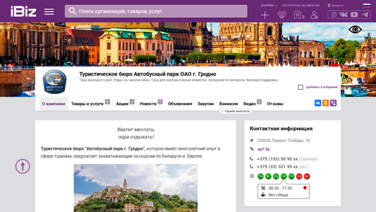 | AI-анализ | This online resource is a tourist bureau named "Autobusny Park OAO g. Grodno." It offers various tourist services including weekend tours, vacations by the Black Sea, corporate client tours, and excursions throughout Belarus with visa support. The company's address is 230026, Grodno, Victory Street, 16. Services offered include bus tours in Europe and Belarus, group programs, individual tours, air tours with departure from Belarus, Russia, and Lithuania, shopping tours, spa-resort vacations, ski vacations, and beach vacations. The staff consists of accredited National Tourism Agency tour guides and bus drivers. To book a group tour, one must submit a request to the director of Autobusny Park g. Grodno, Nikolay Drevilo. For individual travel plans, |