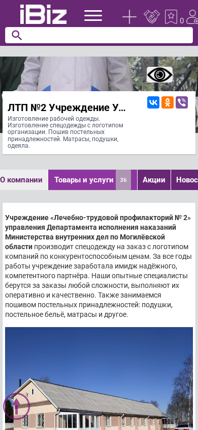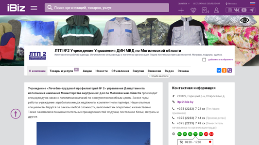 | Название / Заголовок | ЛТП №2 Учреждение Управления ДИН МВД по Могилевской области - Изготовление рабочей одежды. Изготовление спецодежды с логотипом организации. Пошив постельных принадлежностей. Матрасы, подушки, одеяла.. 213422, , Староселье д. |