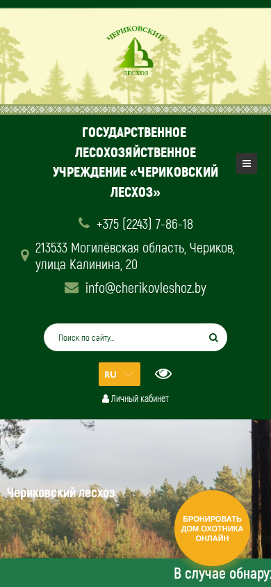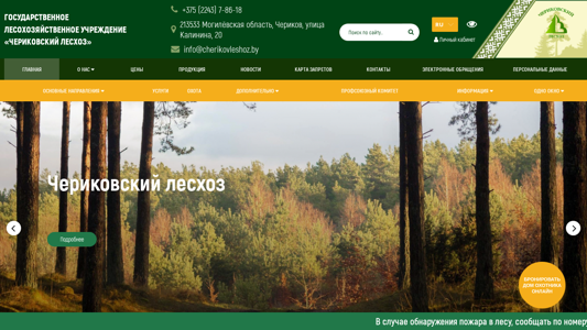 | AI-анализ | --- This online resource is the official website for the State Forestry Enterprise "Cherikovsky Leshoz" located in Belarus, specifically in the town of Cherikov, Mozyr District, Mogilev Oblast. The website provides information about the forestry enterprise, its management, various departments, and services. Key topics include forest management, reforestation, forest protection, industrial activities, and pricing. The site also features sections on radiation control, certification, and procurement procedures. Additionally, visitors can find contact information, news, and a map of restricted areas. The website is available in Belarusian and Russian languages. |