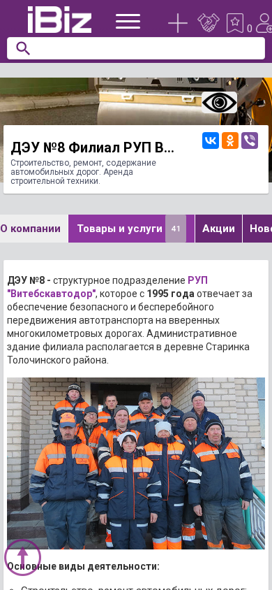 | Название / Заголовок | ДЭУ №8 Филиал РУП Витебскавтодор - Строительство, ремонт, содержание автомобильных дорог. Аренда строительной техники.. 211092, , Старинка д. |