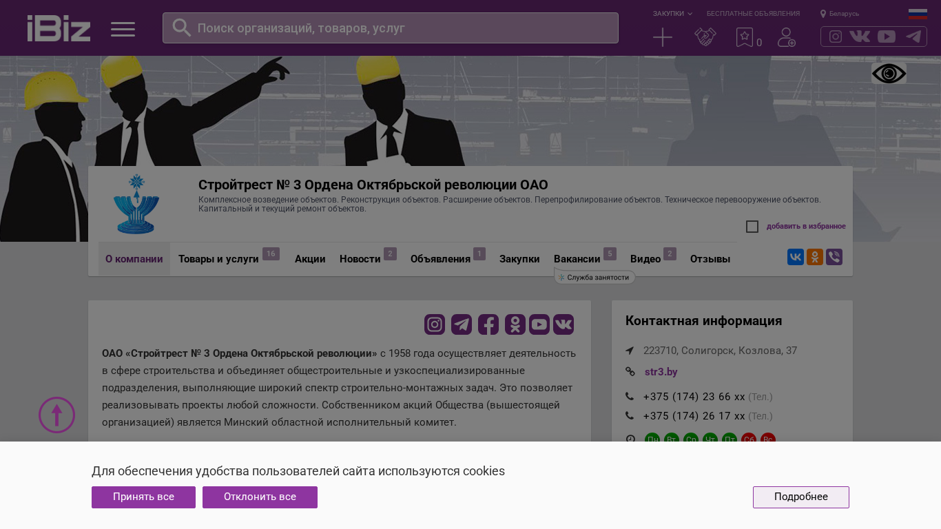 | Название / Заголовок | Стройтрест № 3 Ордена Октябрьской революции ОАО - Комплексное возведение объектов. Реконструкция объектов. Расширение объектов. Перепрофилирование объектов. Техническое перевооружение объектов. Капитальный и текущий ремонт объектов.. 223710, Солигорск, , Козлова, 37 |