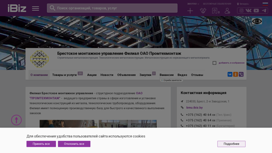 | AI-анализ | The web project "Brestské montážné upravlenie Filial OAO PROMTEHMONTAŽ - Stroijedelné metallokonstrukcie. Technologické metallokonstrukcie. Metallo konstrukcie z neržavejšho metalloľprokata.." is a Belarusian company specializing in the production and installation of metal construction works. The company's main products include both structural and technological metal constructions made from non-rusting metal alloys. The website provides information on the company's location, contact details and services offered, which include the production and installation of metal structures, as well as the installation of technological equipment and piping systems. The company has a fully equipped production facility for the efficient and high-quality completion of projects. The company's primary focus is on the production and installation of metal structures for |