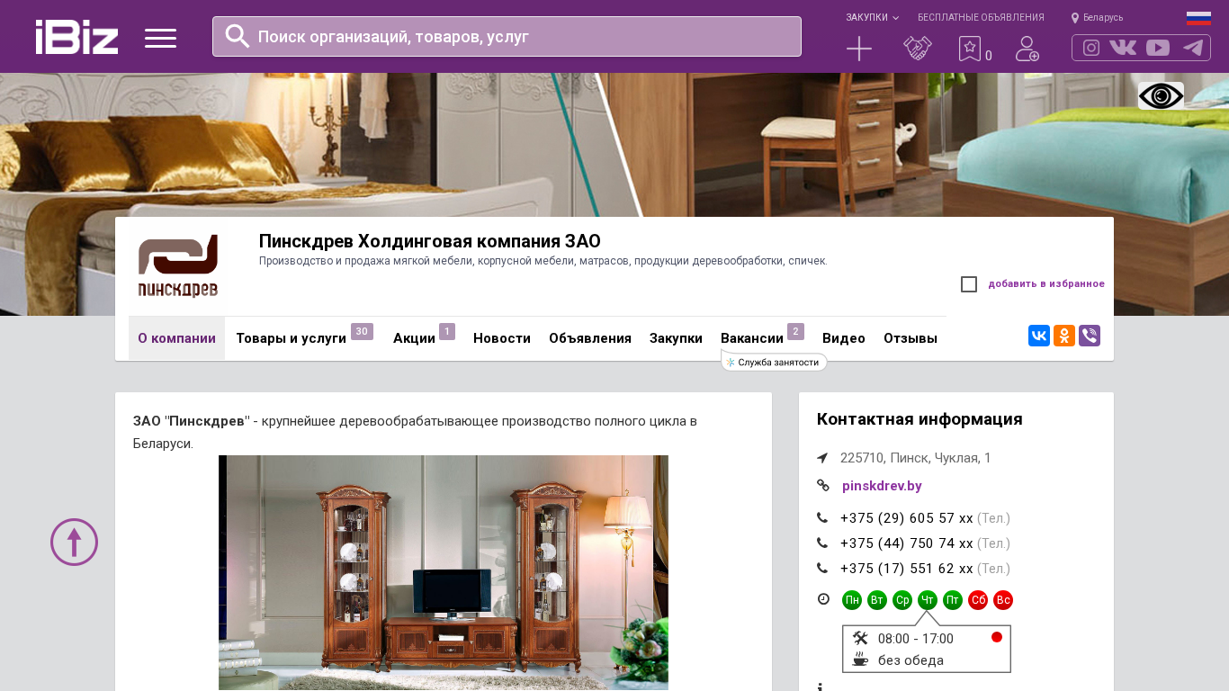 Название / Заголовок | Пинскдрев Холдинговая компания ЗАО - Производство и продажа мягкой мебели, корпусной мебели, матрасов, продукции деревообработки, спичек.. 225710, Пинск, , Чуклая, 1 |