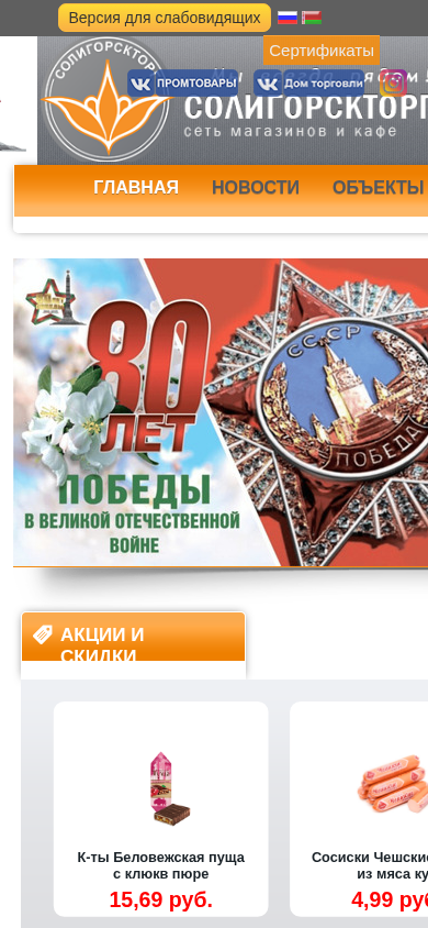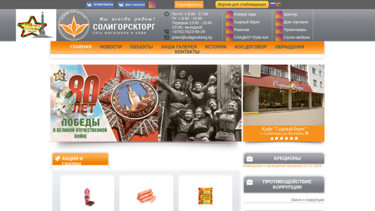 | AI-анализ | --- This website belongs to ОАО Солигорскторг, a trading company based in Soligorsk, Belarus. The website offers a variety of products and services, including food and beverages, cafes, and building materials. Some of the specific offerings mentioned are cafes "Сырный берег" and "Рамонак," the "Клевер парк" shopping center, and the "Сырный берег" and "Рамонак" cafes. The website also features a section for auctions, with an upcoming auction for the right to rent an open area with coverage taking place on October 13, 2025. The website appears to be targeted towards residents of Soligorsk and offers discounts and specials on various items. The website also includes a section for contact information and a book for making suggestions and comments. |