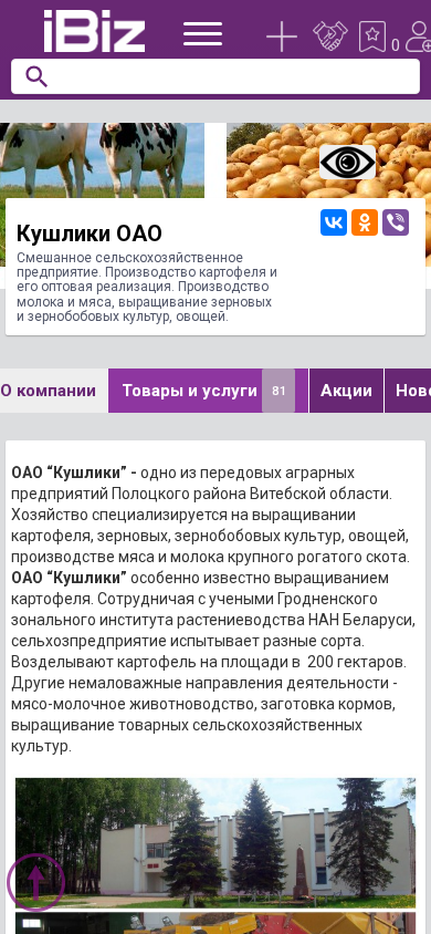 | AI-анализ | The portal kushliki.ibiz.by is a mixed agricultural enterprise, specializing in the production and bulk sale of potatoes and their processing. Additionally, it engages in livestock farming for milk and meat production, cultivation of cereals and legume crops, and vegetable farming. The company, OAO "Kushliki," is located in the village of the same name, in the Central District, in the region of Belarus. It is a leading agricultural enterprise in the Posolsky district of the Vitsebsk region. The company focuses on potato cultivation in 200 hectares, collaborating with the Grodno Zonal Institute of Agriculture of the National Academy of Sciences of Belarus to experiment with various potato varieties. Other significant areas of activity include livestock farming, fodder procurement, and the cultivation of marketable agricultural |