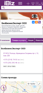 | AI-анализ | This website is a business consulting firm, BelBiznesExpert OOO, offering accounting services, audit for individuals and small to medium-sized businesses. They specialize in managing separate accounting sections, financial, accounting, and management reporting. The company is located in Belarus, specifically in the city of Polotsk, on Francisk Skoriny Prospect 13, apartment 230. Contact information includes phone numbers +375 (214) 74 03 xx and +375 (29) 292 46 xx. The Unified State Register of Legal Entities number is 391617895. The company's opening hours are from 9:00 to 18:00, Monday through Friday, with no lunch break. Services provided include accounting, audit, actions, news, announcements |
