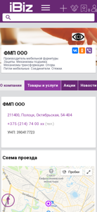 | AI-анализ | The website is a Belarusian business directory listing for FMP OOO, a producer of furniture fittings, including hooks, lifting mechanisms, transforming mechanisms, supports, and belt fasteners. The contact details and address are provided, along with information about company hours and a map for directions. The website also includes a section for job vacancies and a catalog of products and services. The domain is registered to OOO "AIBIZ MEDIA," a Belarusian media company. |