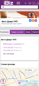 | AI-анализ | The website is a business listing for the company "Авто-Даерс ЧУП," located in Brest, Belarus, at the address Д. Донского, 11. The company offers auto-painting and hauling services. The website provides contact information, including phone numbers, and a map for directions. The company's UNP number is 290725046. The website includes information about the company's opening hours, which are from 9:00 to 18:00, Monday through Friday, with Saturdays and Sundays being days off. The website is part of the "АЙБИЗ МЕДИА" business directory for Belarus. |