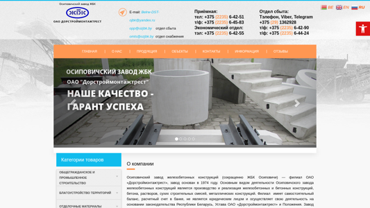 | AI-анализ | This online resource is a website for OZJBK OAO "Dorstruymontazhtrust," which operates the Osipovich Concrete Structures Plant. The site provides information about the company, its products, and contact details. The most frequently used words on the site include "железобетонные" (concrete structures, constituting about 20% of all words), "плиты" (plates, 11%), "375," and "2235." The site also features sections for sales and supplies, and contact information is provided for various departments including sales, snaabging, and the economic department. The website offers products for civil and industrial construction, including multi-chamber concrete slabs, beam and column elements, and foundation elements. The contact email addresses are belrw-dst-ojbk@yandex. |