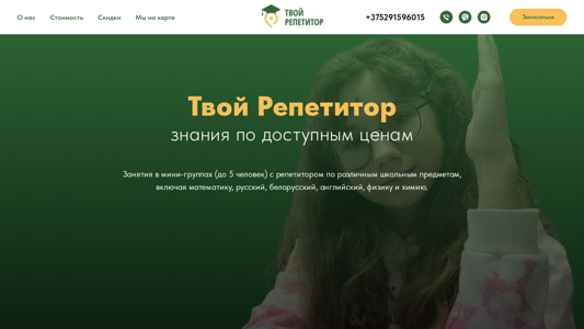 | AI-анализ | The portal Tvoj Repetitor is a Minsk-based tutoring center. The website offers group lessons with up to five students for various school subjects including mathematics, Russian, Belarusian, English, physics, and chemistry. They provide exam preparation for CT and CE. Lessons are conducted in a mini-group setting. Tvoj Repetitor boasts affordable prices and regular promotions, making learning even more cost-effective. The center's team consists of experienced educators: Anna Sviridovich, a BGPU graduate with 15 years of experience in mathematics and informatics; Iryna Tkach, a BGU graduate with 20 years of experience in mathematics; and Margaryta Makarevskaya, an MGLU graduate with 15 years of experience in contemporary foreign languages. The educators' approach focuses on making learning enjoyable and effective, |