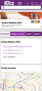 | AI-анализ | The web project "Askon-Mebel OOO" is a Belarusian company based in Brest, specializing in the production of corpus furniture such as cabinets, cupboards, and kitchens. The website offers detailed company information including contact details and a map for visitors, as well as a section for news, announcements, and vacancies. The site also includes a catalog of products and services, with a focus on corporate furniture. The domain askon-mebel.ibiz.by is registered to OOO "Aibiz Media" - a Belarusian business media company. The company's office is located at Карбышева, 21, оф. 231 in Brest, and can be reached via the phone numbers +375 (29) 823 11 xx and +375 (162) 5 |