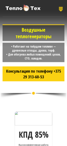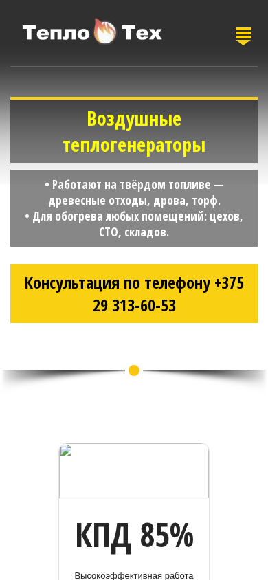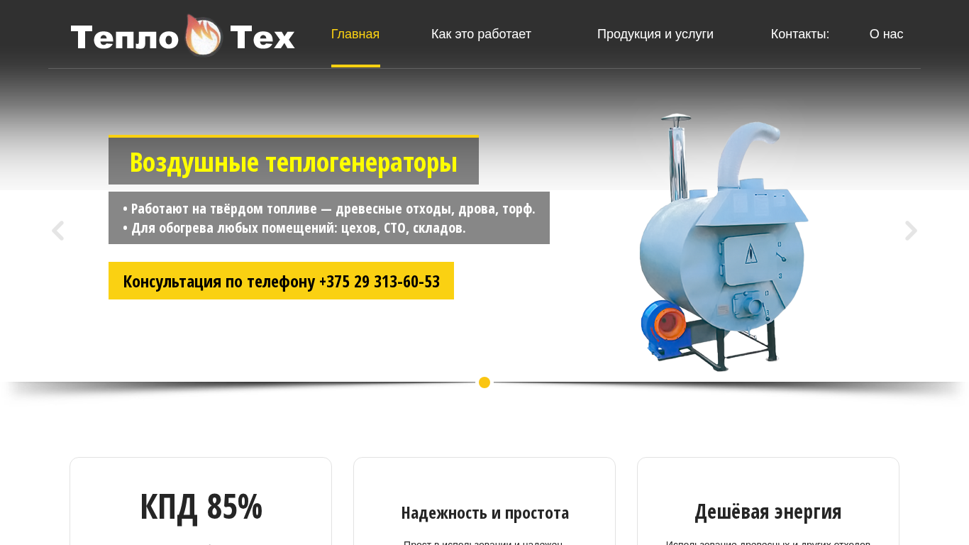 | AI-анализ | --- The website Teplogenerator.by is dedicated to thermal heating equipment produced by a manufacturing company. It offers air-heating generators that operate on solid fuel, such as wood waste, logs, peat, or torf. These generators are suitable for heating various types of buildings, including workshops, STO, warehouses, garages, greenhouses, farms, poultry farms, swine farms, drying facilities, and others. The website provides consultation by phone +375 29 313-60-53. The air-heating generator works by burning solid fuel through pyrolysis or gasification, releasing heat into the air. The generator is easy to use and reliable, with a heating efficiency of up to 85%. The use of solid fuel as a heat source allows for the reduction of energy costs. The website also offers pyroly |