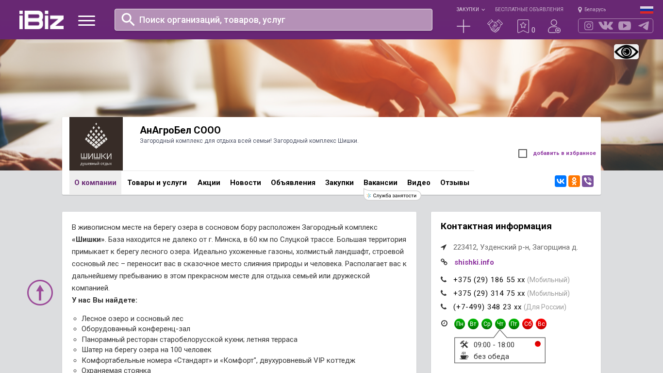 | Название / Заголовок | АнАгроБел СООО - Загородный комплекс для отдыха всей семьи! Загородный комплекс Шишки.. 223412, , Загорщина д. |