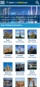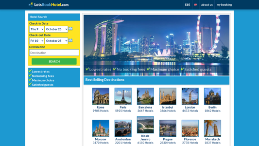 | AI-анализ | The website is called LetsBookHotel.com and describes itself as a platform for booking worldwide hotel accommodations at discounted prices and late deals. According to the provided data, users can search, compare and book hotels, apartments, and possibly other types of accommodations. The website offers booking directly and paying upon arrival. The available currencies for transactions are Euro, U.S. Dollar, Pound Sterling, Australian Dollar, and Canadian Dollar. The top searched destinations include Rome, Paris, Barcelona, Istanbul, London, Berlin, Moscow, Amsterdam, Rio de Janeiro, Prague, Florence, and Marrakech. The website also highlights best-selling destinations and offers value accommodation options. Some example hotel listings include "La Cupola del Vaticano" in Rome for €99, "Hôtel Napoleon Paris" in Paris for €293, "Hotel Ser |