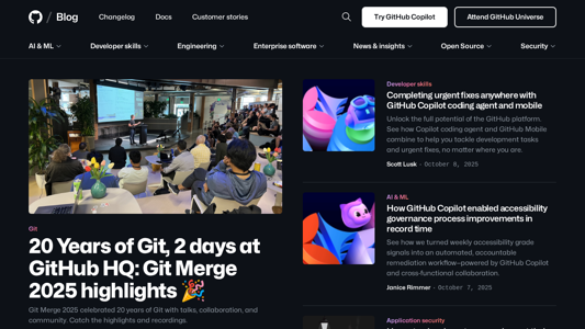 | AI-анализ | This website, titled "Home - The GitHub Blog," provides updates, ideas, and inspiration for developers to build and design software using GitHub. The keywords associated with the site include "github," "and," "the," "how," "security," "learn," "2025," "for," "with," "more," "developer," "open," "source," "copilot," "your," "you," "software," "insights," "build," "into," as well as terms related to generative AI, machine learning, developer skills, programming languages, GitHub Education, and various engineering topics. The site offers content on artificial intelligence and machine learning, how AI code generation works, developer skills, application development, career growth, GitHub improvement, and engineering principles. Users can also learn about GitHub Copilot, a tool that changes how one works with GitHub, as well as |