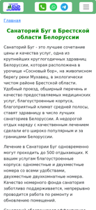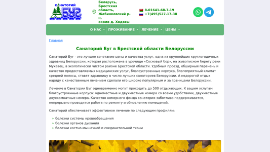 | AI-анализ | The website is the official site of Sanatorium Bug, a large, year-round health resort located in the Soсновый Бор area of the Brest Region in Belarus. Set on the picturesque banks of the Muhavets River in an ecologically clean area, the sanatorium offers a combination of affordability and high-quality services, making it one of the most popular health resorts in Belarus. The resort is easily accessible and provides a wide range of medical services, comfortable accommodations, and various amenities. Sanatorium Bug specializes in the treatment of cardiovascular, respiratory, and musculoskeletal diseases, and can accommodate up to 500 guests at a time. The resort features well-maintained single and double rooms, as well as two-bedroom apartments, all equipped with modern comforts. The sanatorium's extensive |