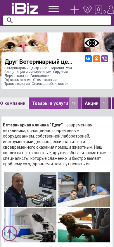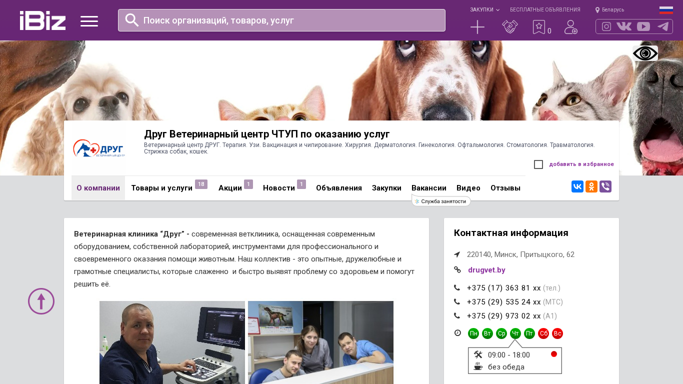 Название / Заголовок | Друг Ветеринарный центр ЧТУП по оказанию услуг - Ветеринарный центр ДРУГ. Терапия. Узи. Вакцинация и чипирование. Хирургия. Дерматология. Гинекология. Офтальмология. Стоматология. Травматология. Стрижка собак, кошек.. 220140, Минск, , Притыцкого, 62 |