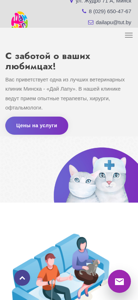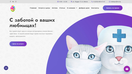 | AI-анализ | The website "Дай Лапу | Ветеринарная клиника ≡ Ветклиника в Минске" (dailapu.by) is a veterinary clinic located in Minsk, Belarus, specifically at ul. Жудро 71A in the Fruzhensky district. The clinic offers services such as appointment booking, castration, ultrasound (УЗИ), radiography (рентгент), and vaccination for pets. The clinic's team consists of experienced veterinarians including therapists, surgeons, and ophthalmologists. The clinic's website provides information about its services, team, and contact details. The operating hours are from 9:00 to 21:00. The clinic offers a pharmacy and various veterinary surgeries. Veterinarians perform surgical interventions to save the |