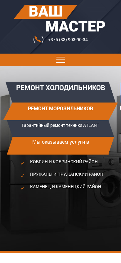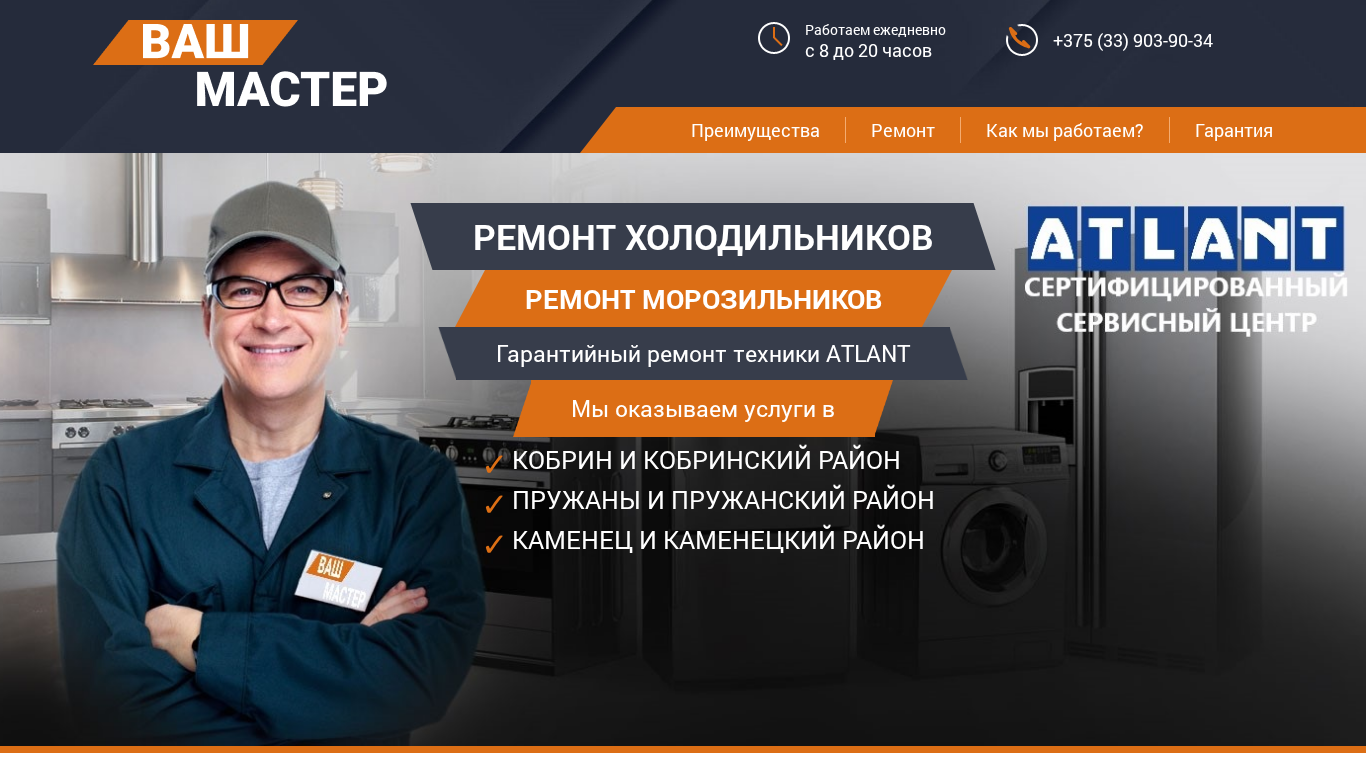 | SEO-описание | Выполним качественный гарантийный, не гарантийный ремонт и обслуживание холодильников, морозильников на дому клиента ❄ Большой опыт ❄ Гарантия ❄ Кобрин и Кобринский район ❄ Пружаны и Пружанский район ❄ Каменец и Каменецкий район |