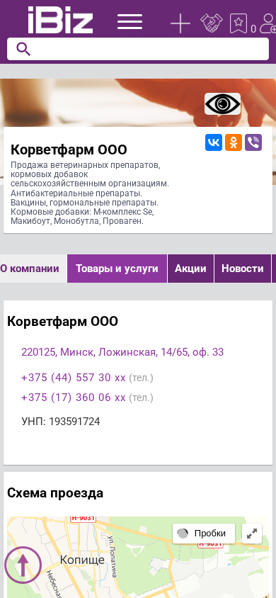 | AI-анализ | The web project "Корветфарм ООО" is a Belarusian company based in Minsk, selling veterinary preparations and corn additives to agricultural organizations. The product range includes antibacterial preparations, vaccines, and hormonal preparations. Corn additives offered are M-комплекс Se, Макибоут, Монобутла, and Проваген. The website provides a scheme for reaching the company, along with contact telephone numbers. The Unified State Register number for the company is 193591724. The business hours are Monday to Friday from 9:00 to 18:00, without lunch breaks. The company is listed under the categories "Ветеринарные препараты - производство, продажа" and "Корма, кормовые добавки" in the |