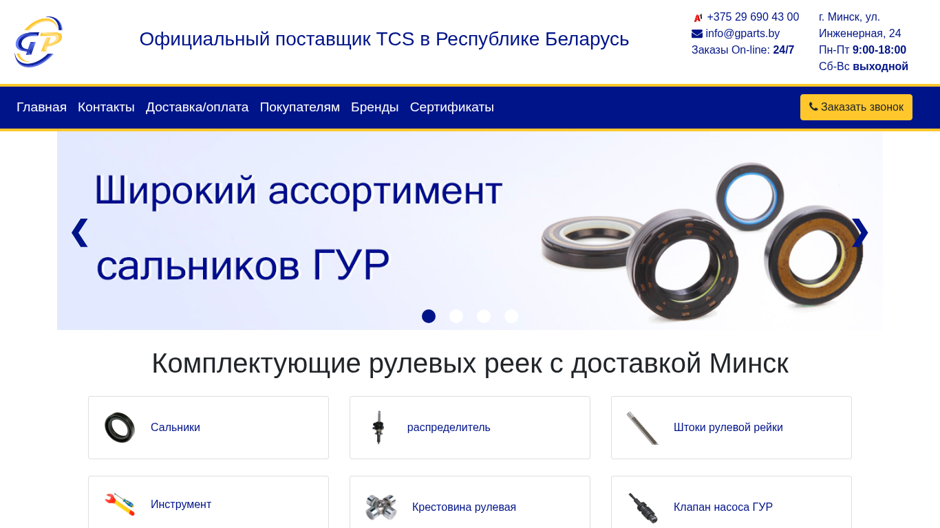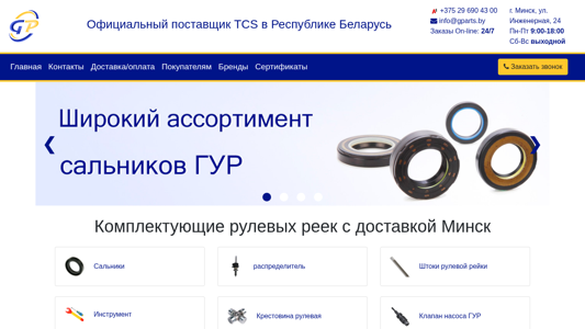 | AI-анализ | The web project gparts.by specializes in the sale of components and complete sets for TCS steering columns. The official supplier of TCS in the Republic of Belarus, the website offers a wide range of products, including steering column parts and accessories, such as rubber rings, hydraulic pumps, and pusher rods. The company boasts quick delivery and consultation services within Belarus, with a phone number for customer inquiries listed on the website. The website also includes information on the location of the business in Minsk and its operating hours. Brands and certificates are also featured on the site. |