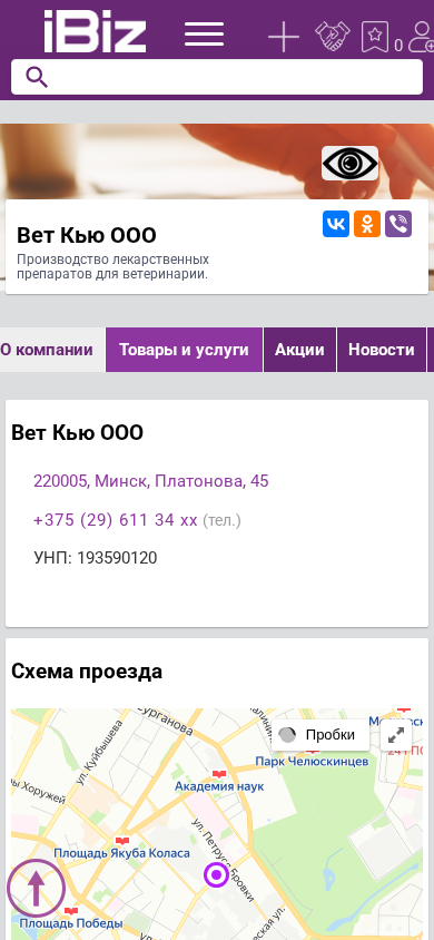 | AI-анализ | This website is for Вет Кью ООО, a company based in Минск, Belarus, located at Платонова, 45. The company specializes in the production of pharmaceutical products for veterinary use. The website provides information about the company, its products and services, and contact details, including a phone number (+375 29 611 34 xx) and the company's UNP number (193590120). The website also includes a map and directions for how to reach the company, as well as operating hours (Monday to Friday, 9:00 AM to 6:00 PM, without lunch breaks). The site is categorized under "Ветеринарные препараты - производство, продажа" in the Yandex Business Directory. |
