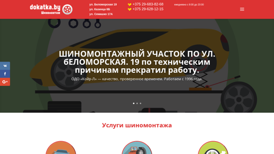 | AI-анализ | --- The web project "Dokatka.by" is a tire service based in Minsk, Belarus, offering wheel balancing, disk grinding, and tire repair. The services are available in the First of May, October, and Moscow districts. The contact information includes three phone numbers and addresses at ul. Belomorskaya 19, ul. Kazintsa 6B, and ul. Semashko 17A. The tire shop operates every day from 8:00 to 20:00. The business, named ODO "Koyr-L," has been in operation since 1996 and offers discounts to veterans, people with limited abilities, and regular clients. The pricing varies depending on the tire size and weight for balancing. The prices for light vehicles start at 40 rubles, off-road vehicles at 55 rubles |