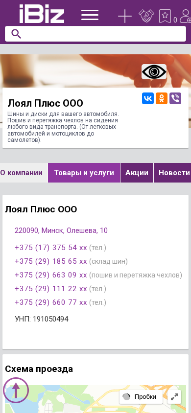 | Название / Заголовок | Лоял Плюс ООО - Шины и диски для вашего автомобиля. Пошив и перетяжка чехлов на сидения любого вида транспорта. (От легковых автомобилей и мотоциклов до самолетов). . 220090, Минск, , Олешева, 10 |