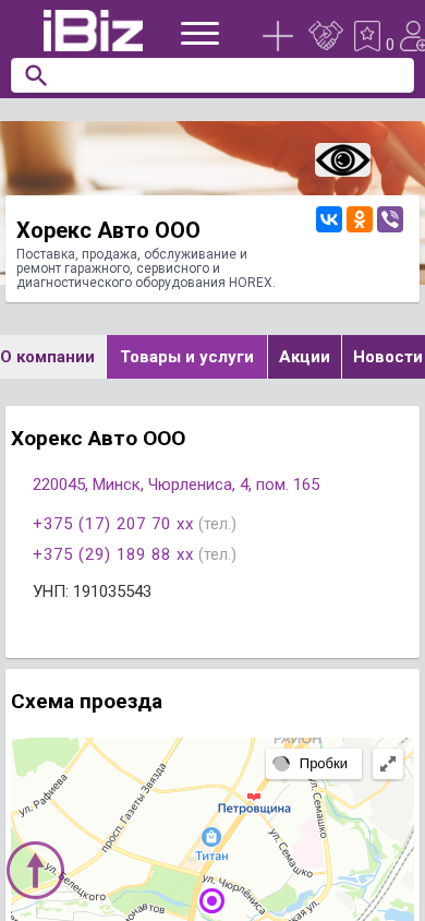 | AI-анализ | This online resource is a Belarusian business website for HOREX Auto OOO, a company providing sales, servicing, and repair of garage, service, and diagnostic equipment under the HOREX brand. The company is located in Minsk, Belarus, at Chyurlenisa 4, apartment 165, and can be contacted via phone at +375 (17) 207 70 xx or +375 (29) 189 88 xx. The website includes information on the company's products and services, as well as contact details and a map for easy access. The company operates Monday to Friday from 9:00 to 18:00 without lunch breaks. The website is categorized under 'Equipment for gas stations, auto washes, and auto repair shops' and 'Equipment for |