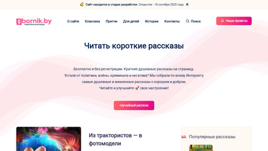 | AI-анализ | --- This website is a collection of short stories titled "Сборник коротких рассказов - читать короткие рассказы" (A Collection of Short Stories - Read Short Stories). The site is under development with an opening date of October 16, 2025. It offers free and registration-free reading of short, spiritual, and uplifting stories about love, relationships, and life. Visitors can read about 8 minutes, 7 minute, and 4 minute long stories, titled "Из трактористов — в фотомодели", "Против ветра", and "Ангел", respectively. Other titles include "Идеальная девушка для мужчины после 40", "Новый год в студенческой общаге…", and "Как изменить мир вокруг |